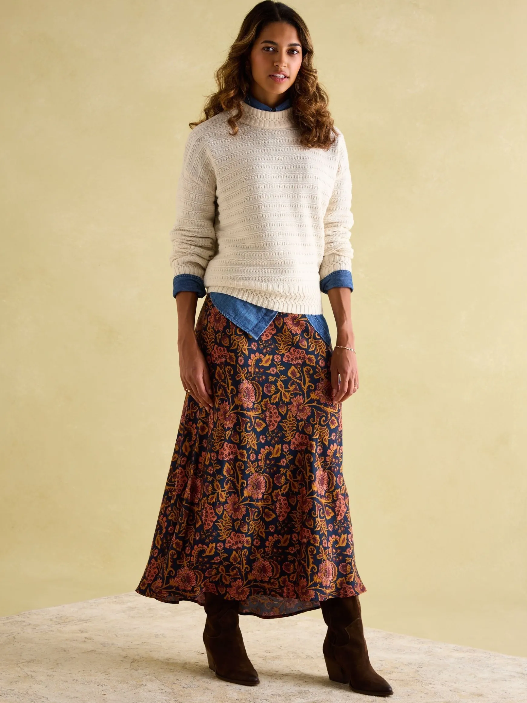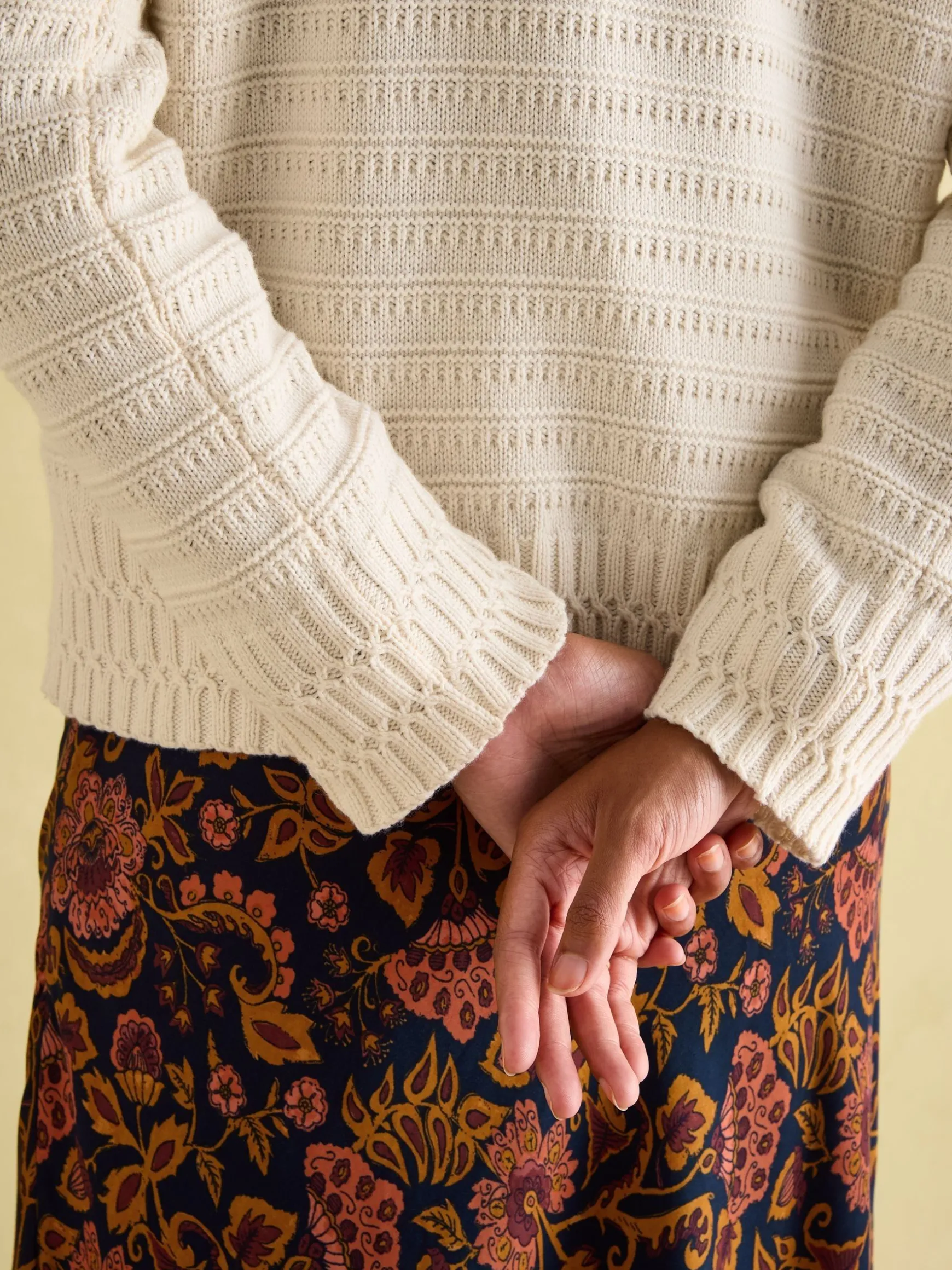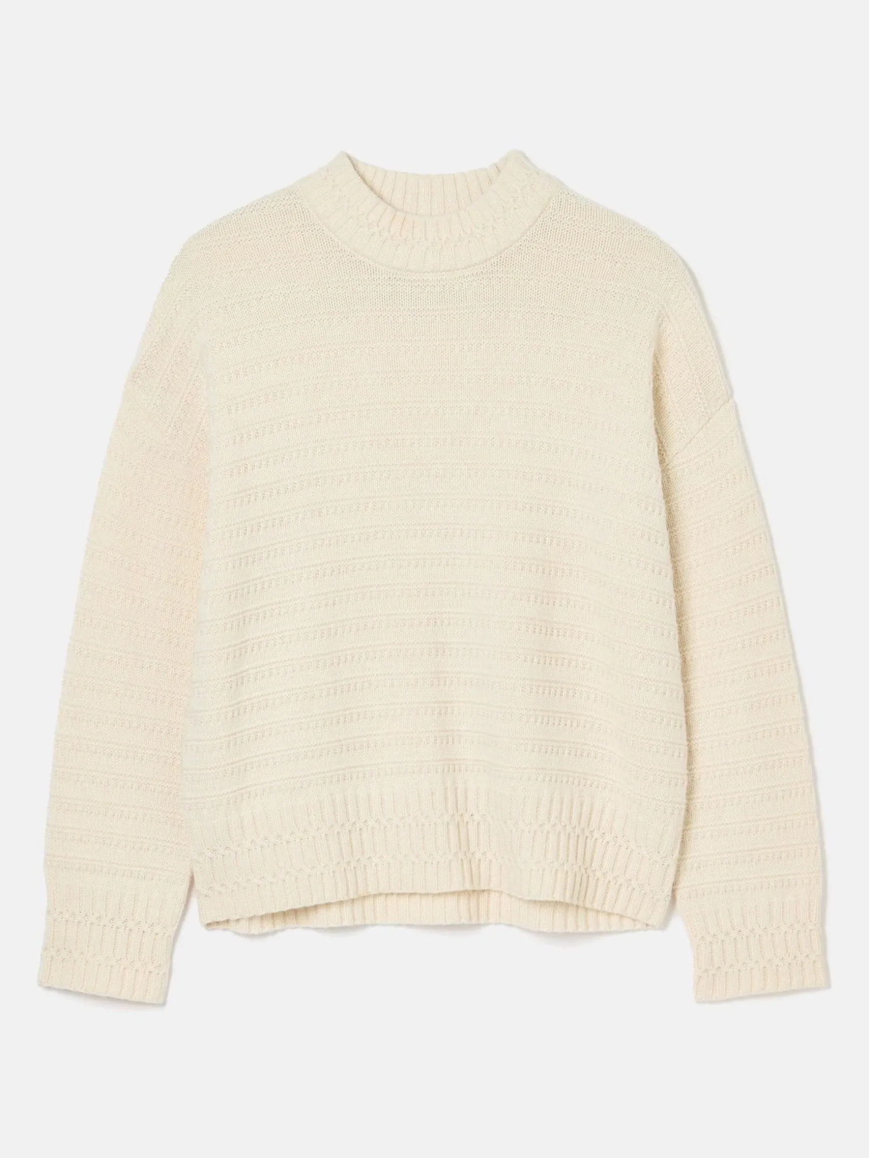 The Bernie knit has a story to tell. Our take on the traditional Guernsey or ‘Gansey’ knit, it features a mix of traditional details with a Joules twist. Guernsey knits were originally designed for hardworking fishermen. So, we’ve used a detailed stitch on the cuffs and neck as a nod to twisting ropes and homage to the jumper’s origin. Another characteristic of this style is a tight-knit construction which historically created a hardwearing finish to fend off the harsh conditions at sea. Our knitwear designers have used a blend of jersey and purl stitch techniques throughout the body and sleeves to emulate this texture and durability. We’ve added dropped shoulders for a relaxed feel and wide sleeves. The quality cotton and wool blend, combined with the neutral colour makes it a timeless style you’ll never regret investing in. Inspired by traditional Guernsey knits. Tight-knit construction. Relaxed fit. Wide sleeves. Dropped shoulders. Round neck. Twisted stitch detailing to the neck and cuffs.