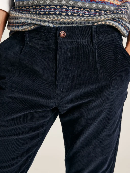 Hardy and built to stand the test of time, a pair of cord trousers navy are a trusty style you can confidently rely on. This pair are crafted from cotton corduroy, have a straight fit through the leg, gentle pleating to the front and a zip fly fastening with faux horn button. They benefit from front and back pockets as well as belt loops. Team them with a checked shirt, gilet (and maybe some wellies) for a look fit for the countryside. Cotton corduroy. Straight leg. Zip fly fastening. Faux horn button fastening. Belt loops. Two side pockets. Two back welt pockets with button fastenings. Gentle pleats to the front.