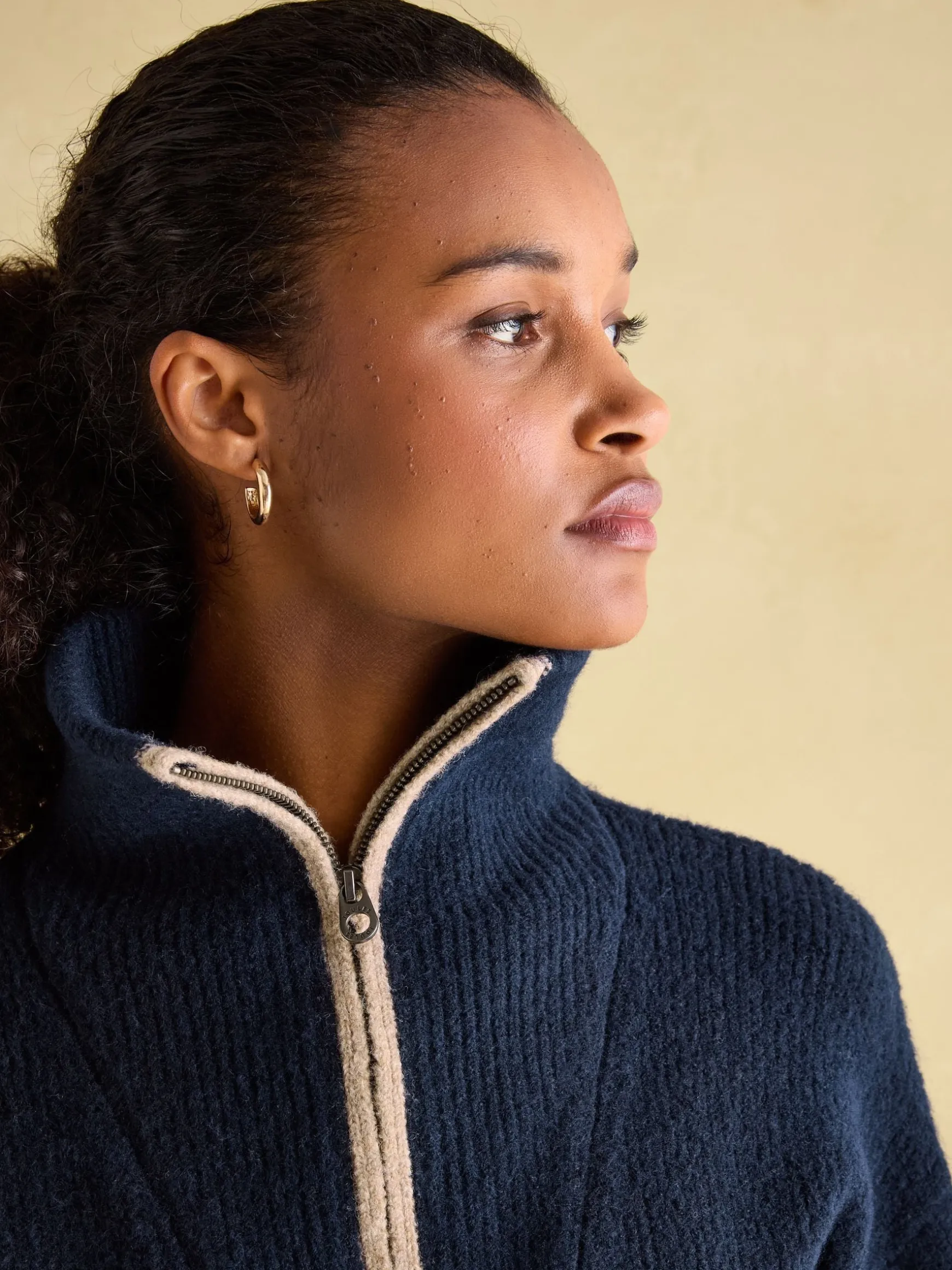 Elevate your knitwear this season with the Elmore jumper. Its quarter zip fastening and dropped shoulders gives it an effortless ‘throw on’ feel, that will keep you comfortable and stylish. The oversized ribbed collar adds interest and features contrasting colour tipping. It’s finished with a ribbed hem and cuffs. Style over a slim-fitting top for a layered-up look and your favourite pair of jeans. Knitted. Quarter zip fastening with metal hoop pull. Ribbed oversized collar with contrast colour tipping. Dropped shoulders. Ribbed cuffs with contrast colour tipping. Ribbed hem.