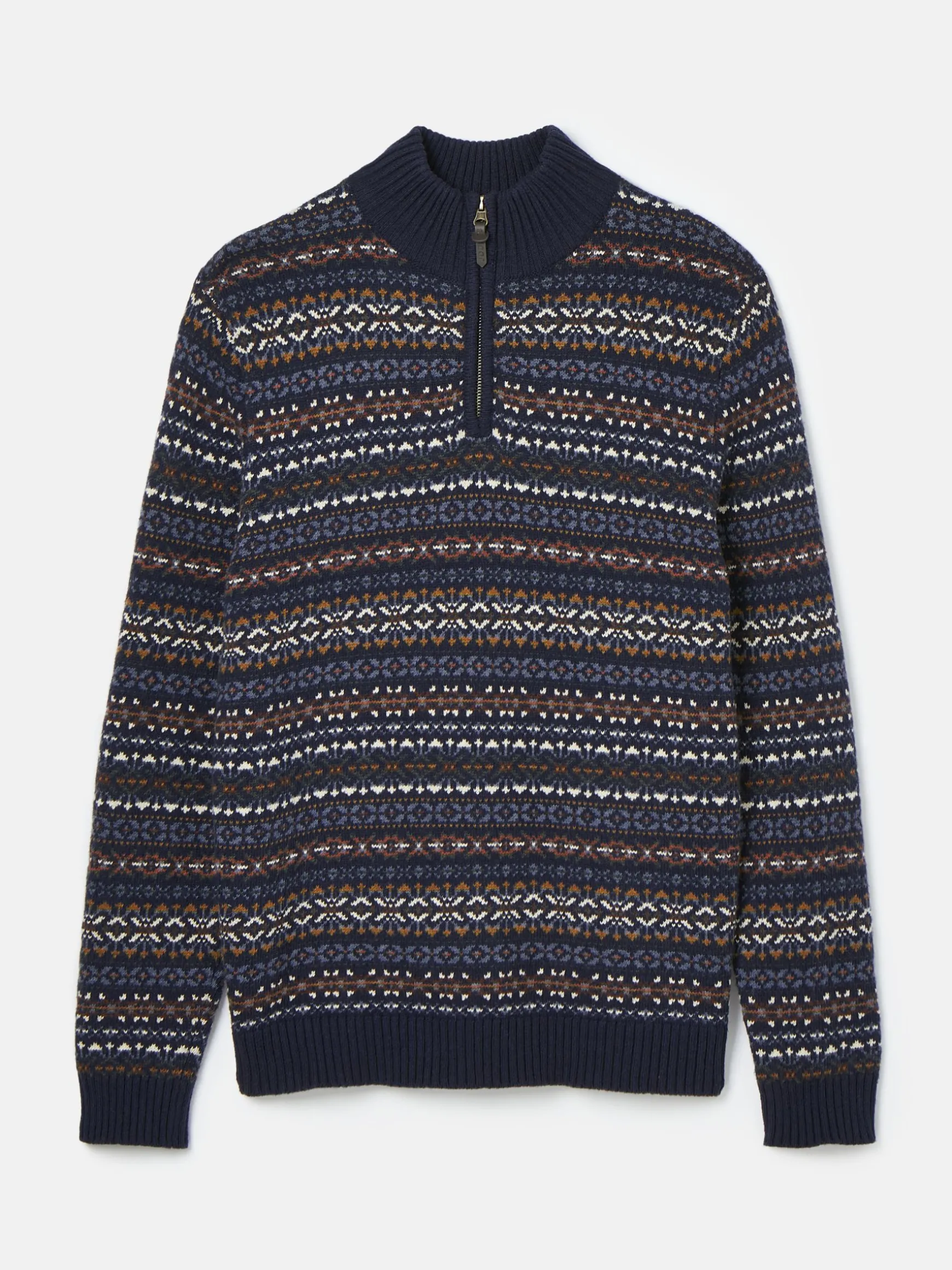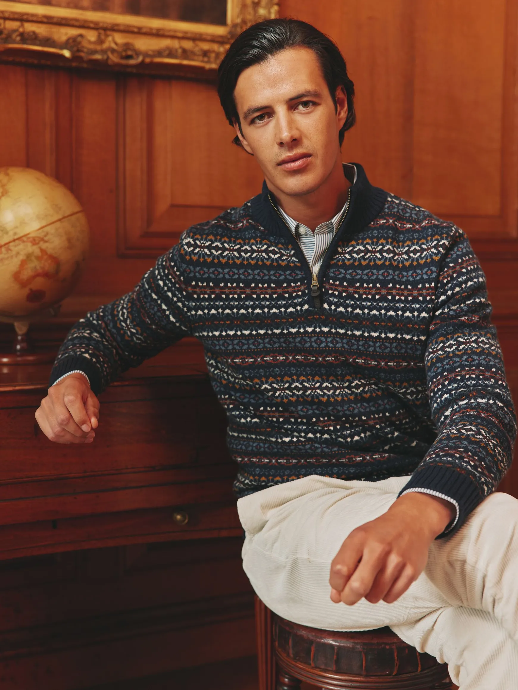 Fair Isle Navy Quarter Zip Knit Jumper Contains Merino Wool