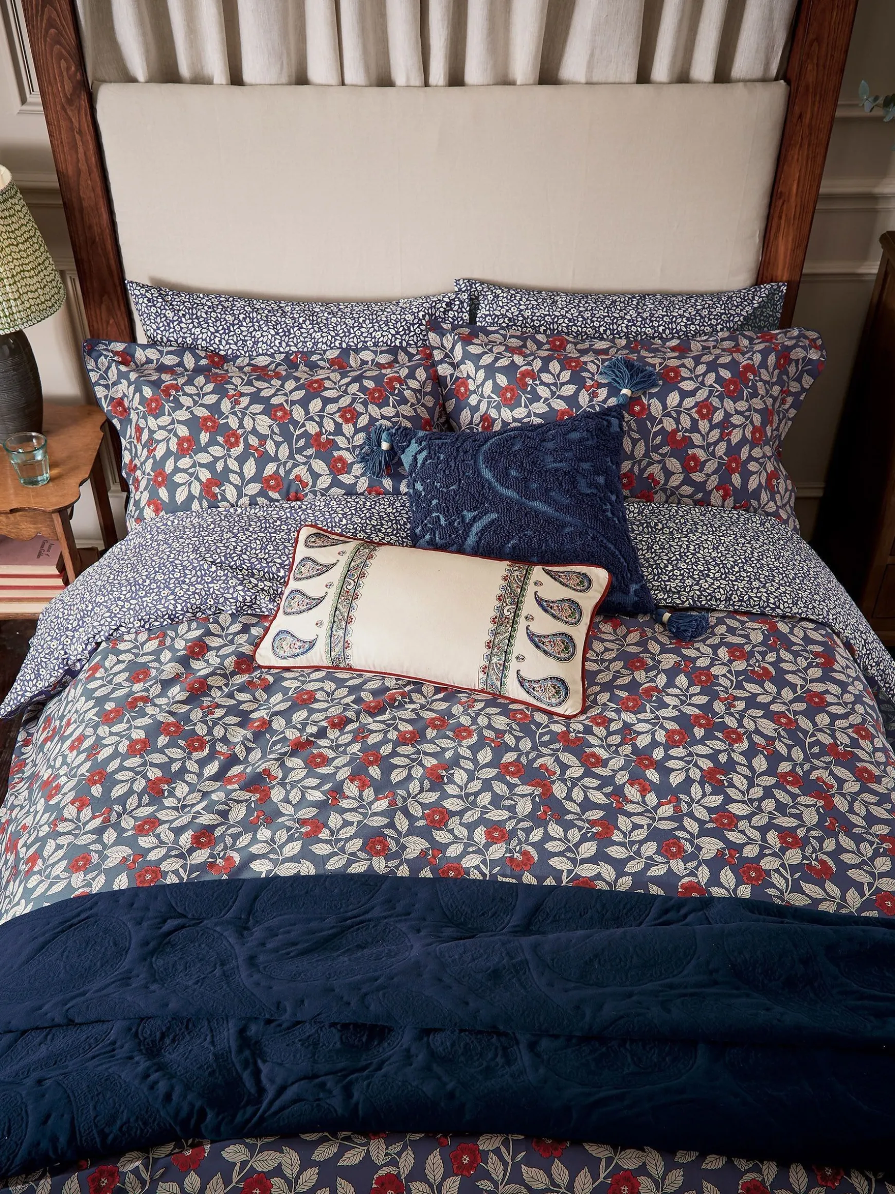 When the winter weekends come around, enjoy staying in bed that little bit longer with the Grove floral bedding set. It’s crafted from soft cotton percale and has a 180 thread count making it comfortable to curl up in. The trailing floral print and its plush colour palette of red and royal blue will have your bedroom feeling opulent and elevated in an instant . The reverse carries the same rich hues in a high-coverage floral ditsy print, so you can flip the set around as you fancy. Two matching Oxford pillowcases come with the set (single beds come with one) while additional standard pillowcases to complement the set can be purchased separately. 100% cotton percale. 180 TC. Trailing floral print. Ditsy floral print reverse. Single: 140x200cm, Double: 200x200cm, King size: 230×220 cm, Super king: 260x220cm. Two Oxford pillowcases with piped trim included in the set. Pillowcases: 74x48cm (plus 5cm flange).
