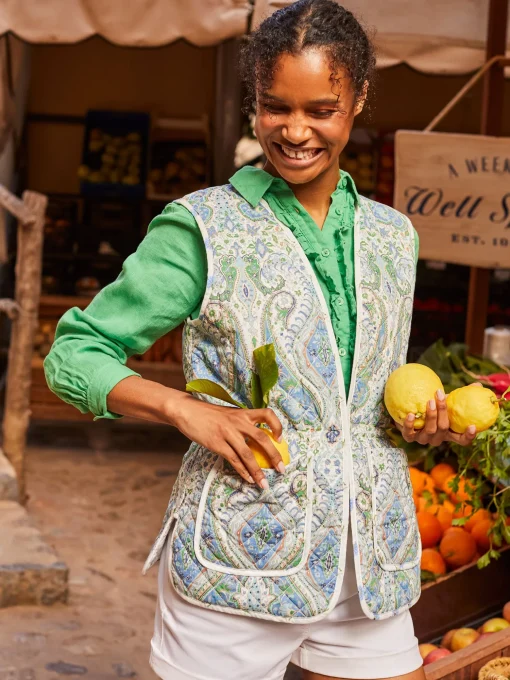 Add a touch of opulence to your outfits with the Hatfield cotton gilet. Designed to be a statement last layer, it’s adorned with an intricate paisley print and is quilted and lightly filled with flat wadding. The perfect piece for those long spring and summer evenings, it’s lightweight and cut from a soft cotton. For a flattering fit, it has an adjustable waist with fabric ties and a curved hem with side splits. Style with neutrals and allow the piece to speak for itself. Cotton. Quilted and filled with flat wadding. Adjustable waist with fabric ties. Two patch pockets to the front. Curved hem. Side splits. Paisley print