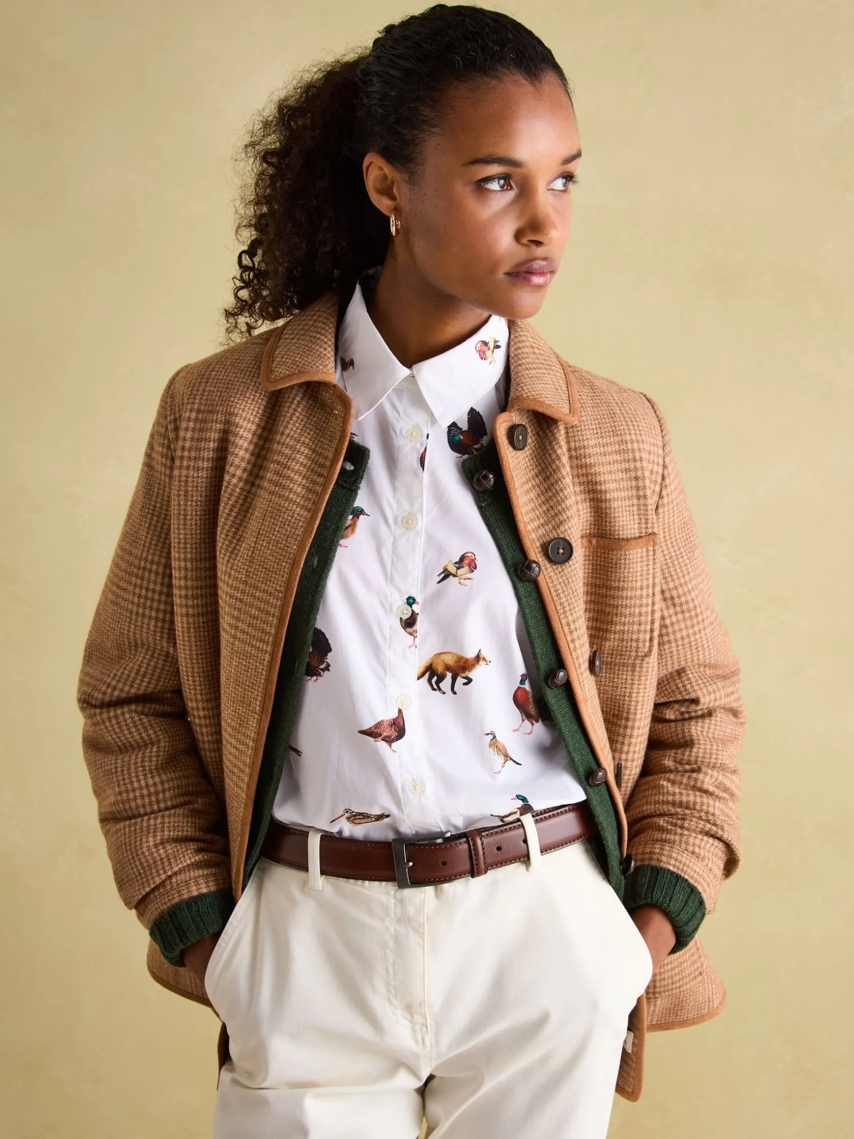 A contemporary take on the classic tweed jacket. This investment-worthy piece has been crafted from herringbone tweed and is in a fit that will flatter. The perfect layer to finish off any country-inspired ensemble, it has a well-shaped collar and concealed button fastening to the front to keep things clean. A single chest pocket along with two patch pockets add an extra element of practicality, whilst an internal waist adjuster can bring things in for extra shape. Inside you’ll find a classic Joules print, hand-drawn by our very own print team at our design studios in Market Harborough.nnTweed jacketnCollarnConcealed button fasteningnPocketsnInternal waist adjusternHanging loopnPrinted lining